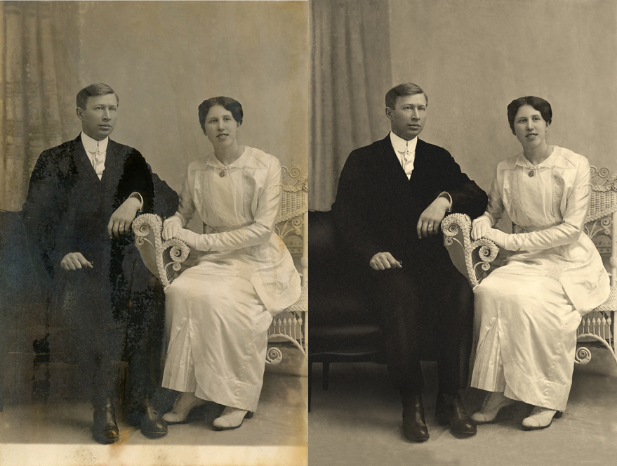 We use a variety of image editing techniques to remove damage and aging effects from the digital copies of your physical photographs.